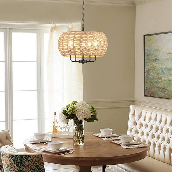 5-Light Black Candlestick Hanging Linear Chandelier Lighting with Brown Hemp Rope Shade for Kitchen Island