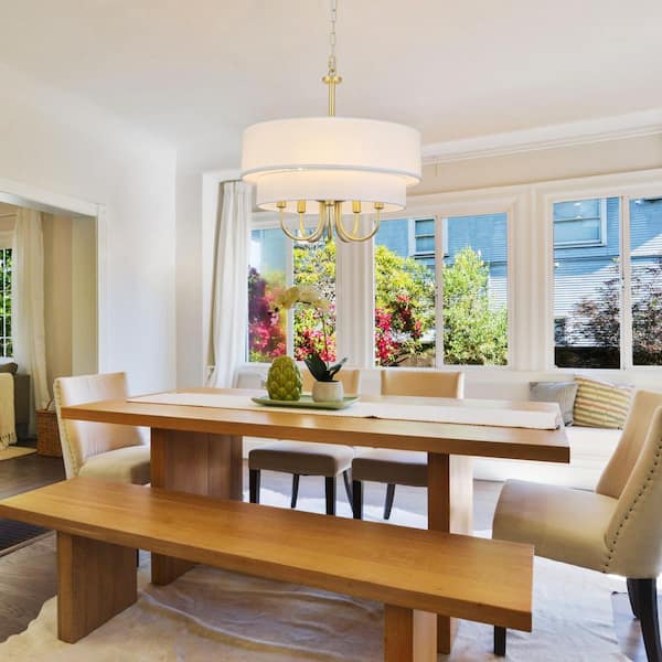 5-Light Drum Gold Pendant Design Hanging Linear Chandelier Lighting Fixture with Cloth Cover for Kitchen Island