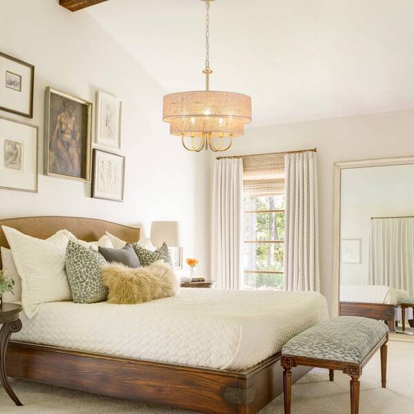 5-Light Gold Candlestick Chandelier Linear Chandelier Lighting with Burlap Cloth Cover for Kitchen Island