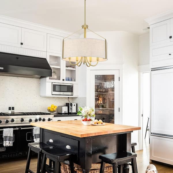 5-Light Gold Candlestick Hanging Linear Chandelier Lighting Fixture with Cloth Shade for Kitchen Island