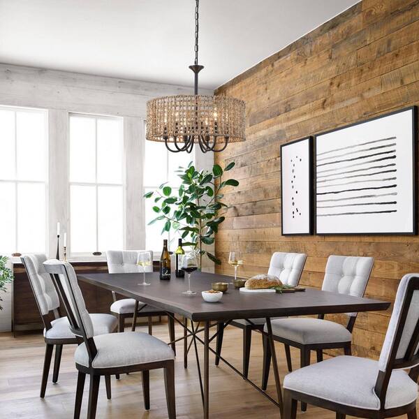 6-Light Black Hanging Ceiling Candlestick Linear Chandelier Lighting with Rattan Shaded for Kitchen Island