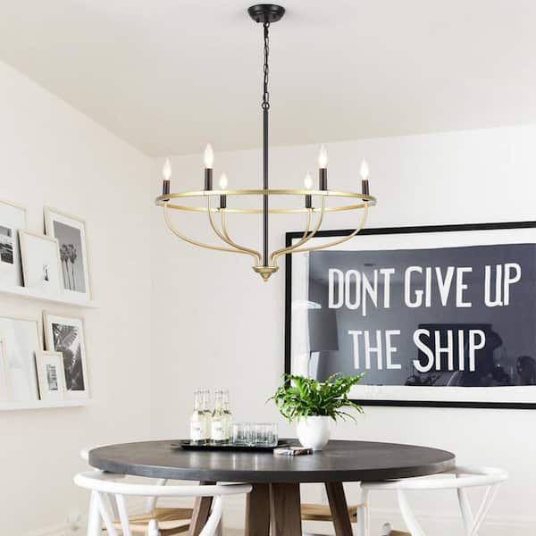 6-Light Black and Gold Traditional Circle Hanging Candlestick Linear Chandelier Lighting for Dining Room Kitchen Island