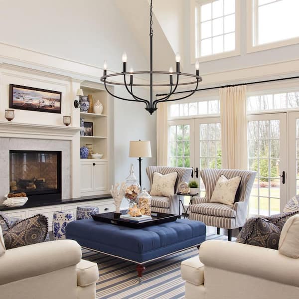 6-Light Black and Wood Grain Traditional Circle Hanging Candlestick Linear Chandelier Lighting for Kitchen Island
