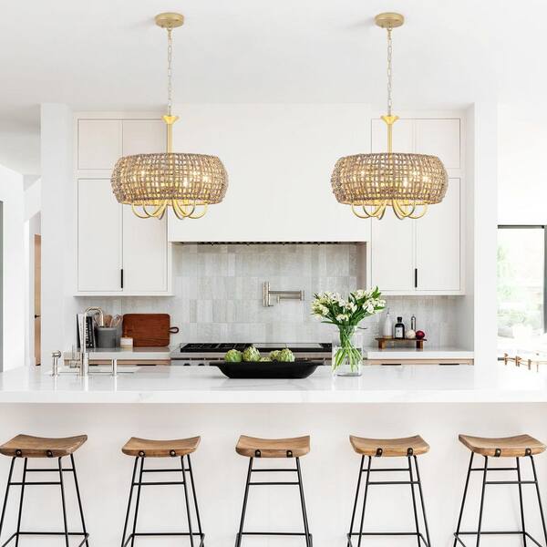 6-Light Gold Hanging Ceiling Candlestick Linear Island Chandelier Lighting with Rattan Shaded for Kitchen Island