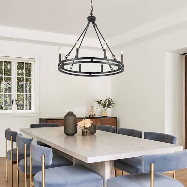 8-Light Black Candlestick Circle Wagon Wheel Chandelier Linear Island Chandelier Lighting for Kitchen Island