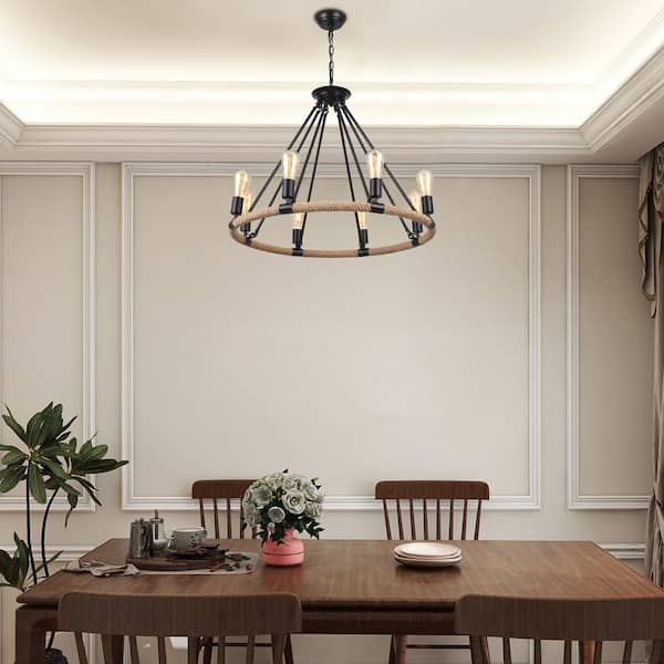 8-Light Black Circle Candle Design Wagon Wheel Chandelier Hemp Rope Linear Lighting Fixture for Kitchen Island