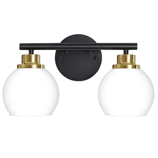 14.6 in. 2-Light Black and Gold Vanity Light with White Frosted Glass Shades