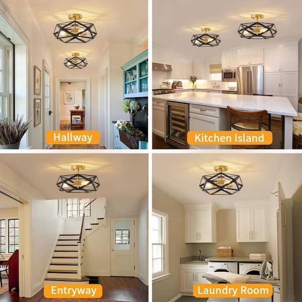 16.1 in. 3-Light Black and Gold Geometric Semi Flush Mount Ceiling Light with No Bulbs Included