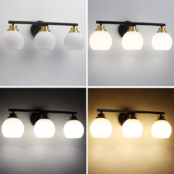 20 in. 3-Light Black and Gold Vanity Light with White Frosted Glass Shades