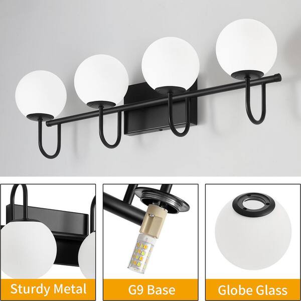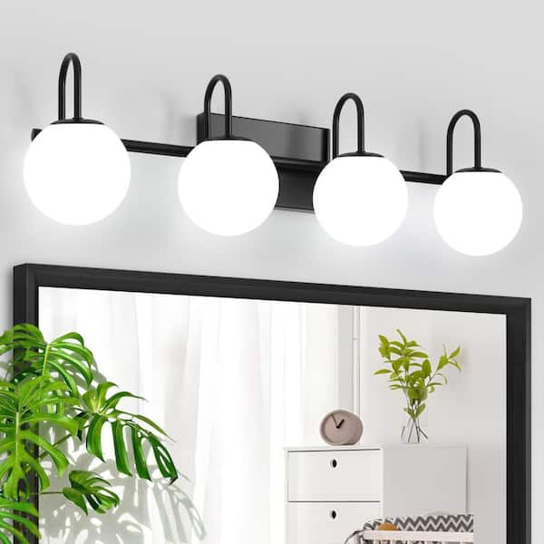 28.34 in. 4-Light Black Vanity Light with White Frosted Glass Shades