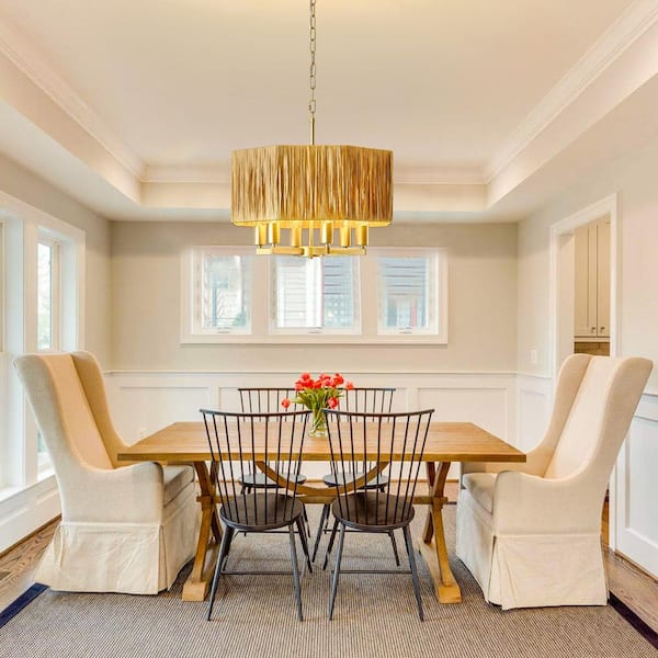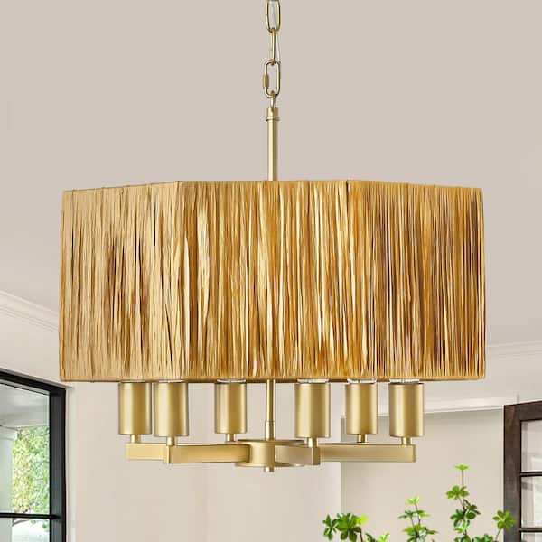 6-Light 20.5 in. Natural and Gold Rattan Bohemian Drum Chandelier for Living Room Kitchen
