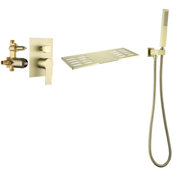 Single Handle 1-Spray Wall Mount Tub Shower Faucet with Hand Shower and Waterfall Spout in Brushed Gold(Valve Included)