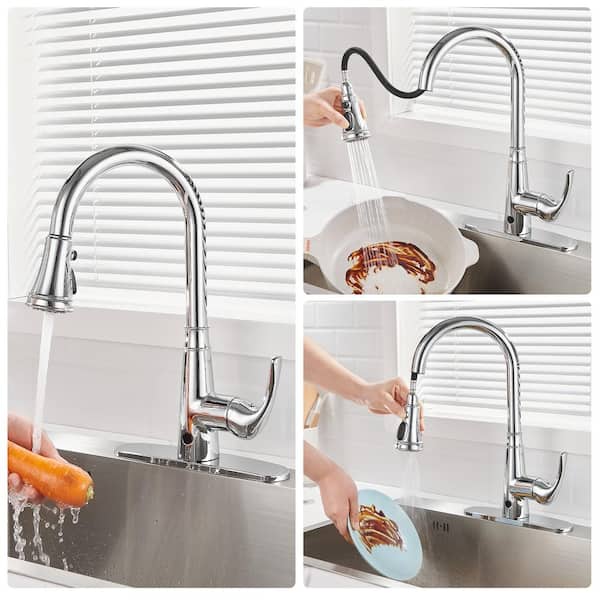 Touchless Gooseneck Single Handle Pull Down Sprayer Kitchen Faucet with Deckplate Pull Out Sink Faucet in Chrome
