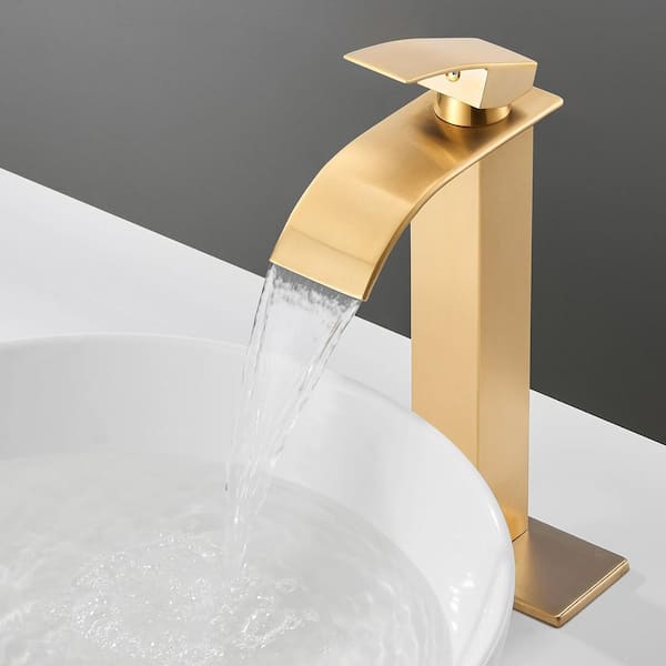 Waterfall Single-Handle Single Hole Bathroom Faucet with Deckplate Pop-up Drain Included and High-Body in Brushed Gold