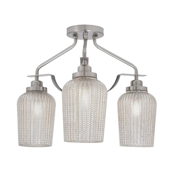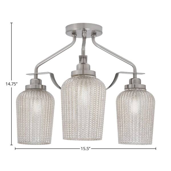 Zara 15.5 in. 3-Light Brushed Nickel Semi-Flush with 5 in. Silver Textured Glass Shades No Bulbs Included