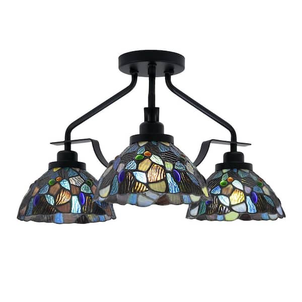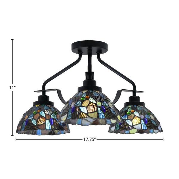 Zara 17.75 in. 3-Light Matte Black Semi-Flush with 7 in. Blue Mosaic Art Glass Shades No Bulbs Included