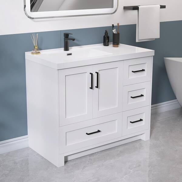 42 in. Solid Wood Left Single Sink Freestanding Bath Vanity Cabinet in White with White Solid Surface Top and Sink