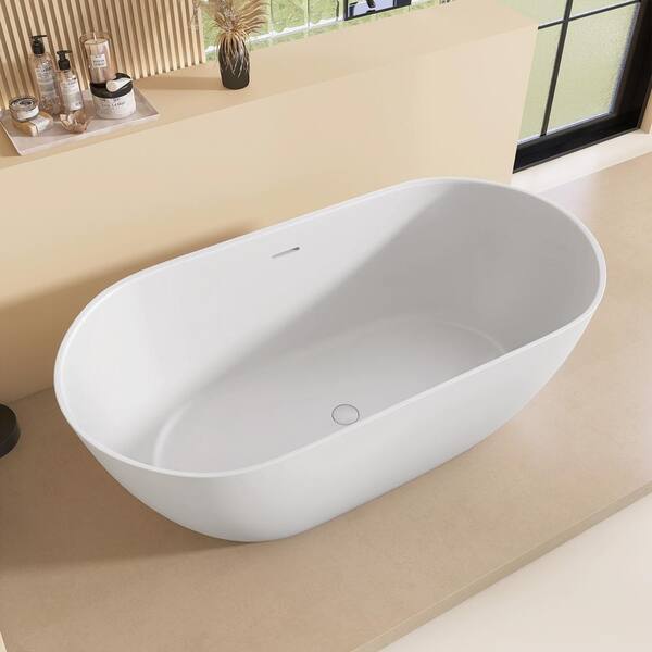 Lux 59 in. x 29.53 in. Solid Surface Stone Resin Soaking Bathtub Deep Freestanding Tub in Matte White with Center Drain