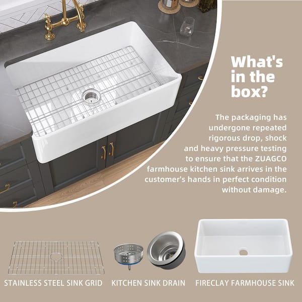 Mac 30 in. x 20 in. White Farmhouse Sink Apron Front Single Bowl Kitchen Sink Fireclay Deep Farm Sink /Grid and Strainer