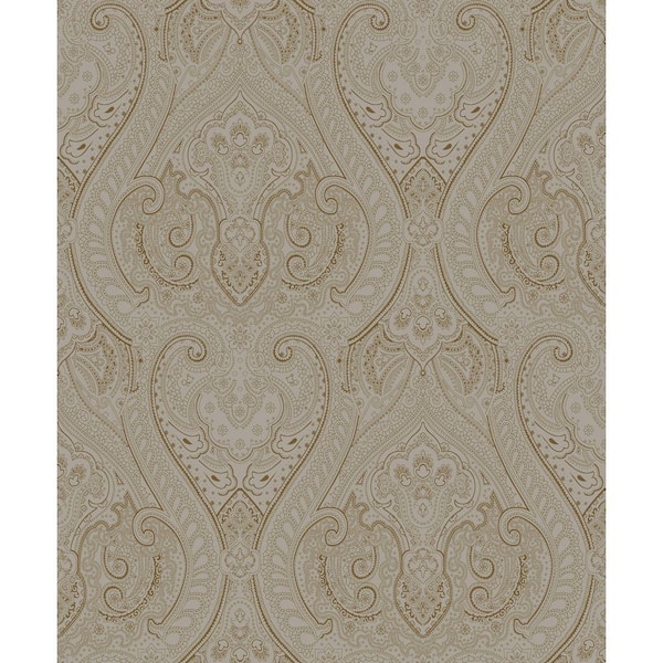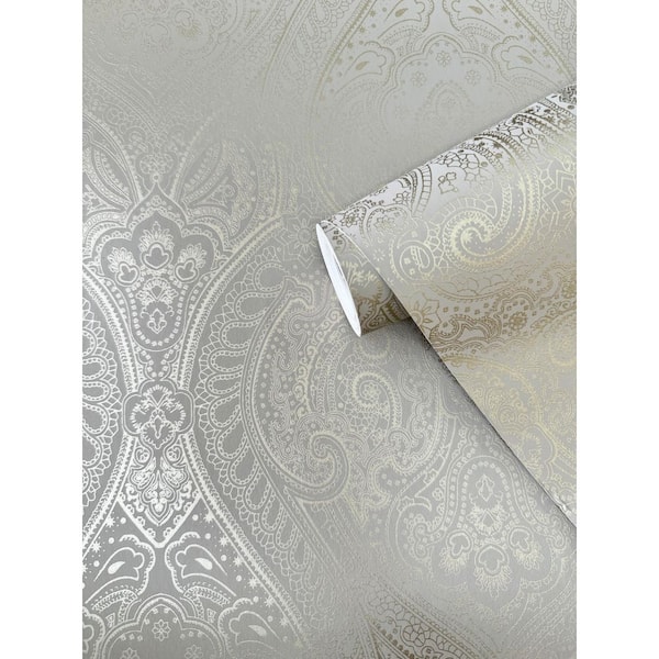 Zen Collection Grey/Gold Lace Damask Metallic Sheen Finish Non-Pasted Non-Woven Wallpaper Roll