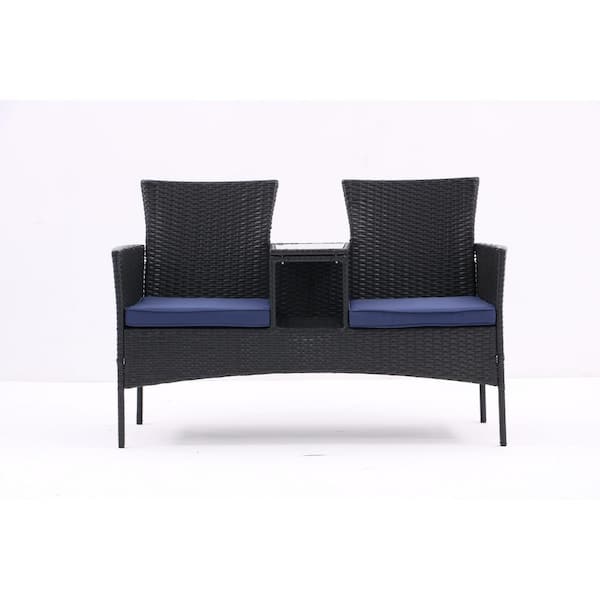 1-Piece Dark Coffee Wicker Outdoor Loveseat with Built-in Coffee Table, Glass Top and Blue Cushions for Garden, Patio
