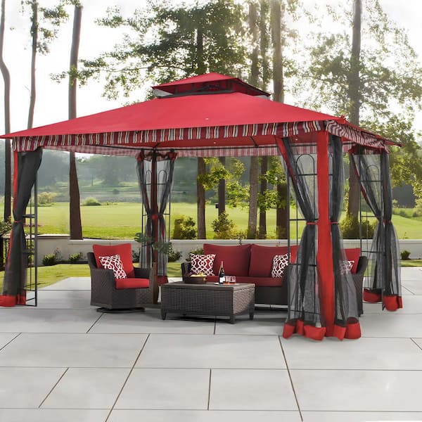 11 ft. x 13 ft. Red Double Tier Roof gazebos with Netting for Patio, Display Shelves for Patio