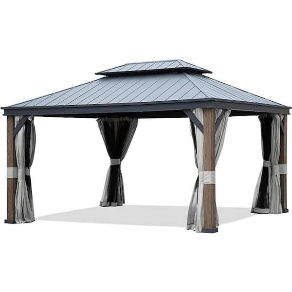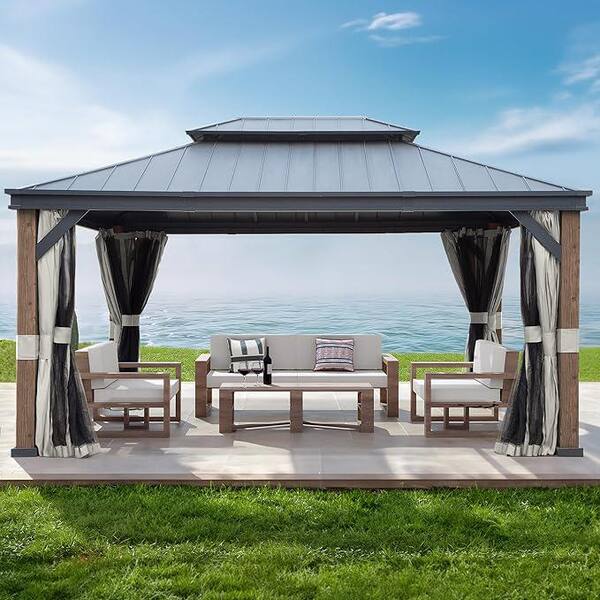 12 ft. x 16 ft. Aluminum Dark Brown Wood-Grain Hardtop Outdoor Gazebo with Double-Vented Top Rustproof, Curtains