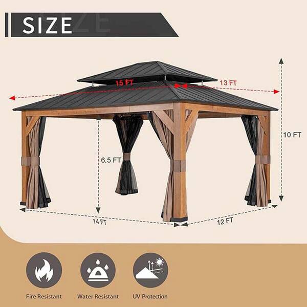15 ft. x 13 ft. Black Wooden Hardtop Gazebo with Curtains and Netting and Wood-Grain Aluminum Frame for Backyard