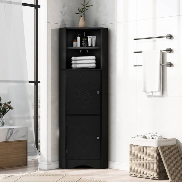 15 in. W x 15 in. D x 61 in. H Black Triangle Corner Linen Cabinet with Adjustable Shelves and Doors