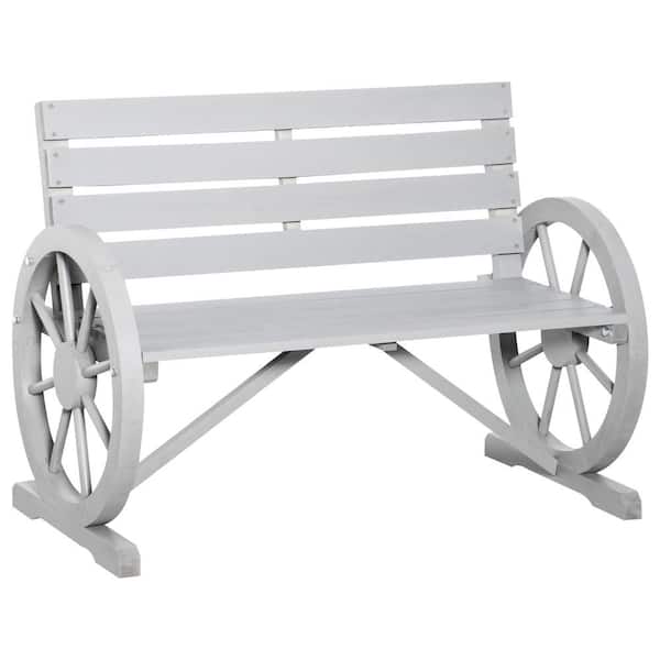 2-Person 41 in. Light Gray Wooden Garden Outdoor Bench Rustic Country Style Wagon Wheel Porch Bench for Backyard, Garden