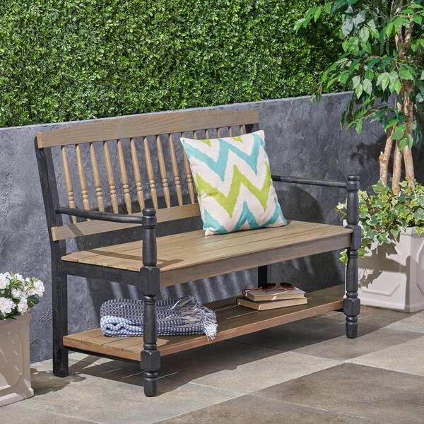 2-Person Gray and Black Wood Outdoor Patio Bench with Shelf for Garden, Backyard, Balcony and Poolside