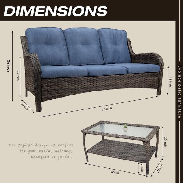 2-Piece 3-Seat Wicker Patio Conversation Set with Blue Cushions and Coffee Table