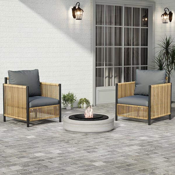 2-Piece Brown PE Wicker Steel Outdoor Single Sectional Sofa with Grey Cushion for Garden, Backyard, Balcony and Poolside