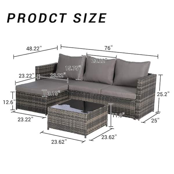 2-Piece Gray Wicker L-Shaped Outdoor Sectional Sofa Set with Dark Gray Cushions and 1 Glass Table