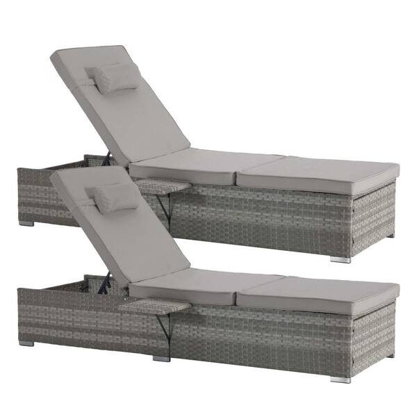 2-Piece Gray Wicker Outdoor Lounge Chairs with Light Gray Cushions and 5-Position Adjustable Backrest