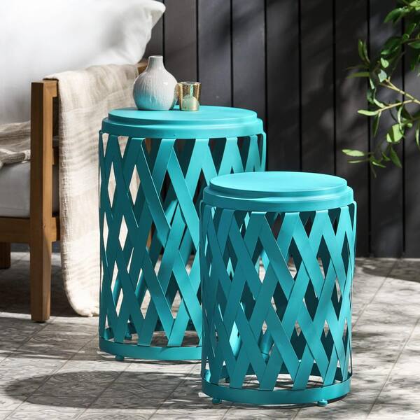 2-Piece Outdoor Round Metal Side Table in Teal for Porch, Balcony, Lawn, Set of 2