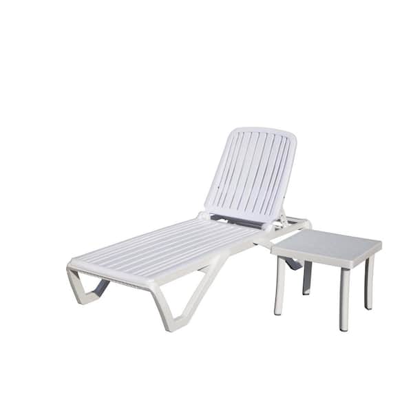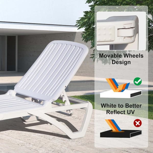2-Piece White Plastic Outdoor Chaise Lounge with Adjustable Backrest and Wheels for in-Pool, Beach, Poolside, Lawn