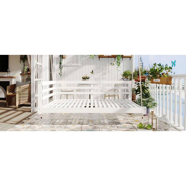 2-Seat White Wooden Twin Size Outdoor Patio Swing Hanging Chair with 4-Piece 96 in. Hemp Ropes