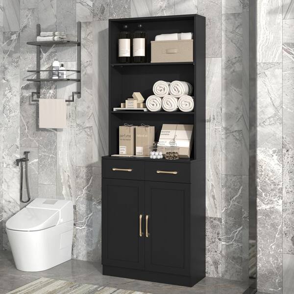 25.9 in. W x 11 in. D x 70 in. H Black Linen Cabinet with 3-layer Open Shelves and 2-Drawers