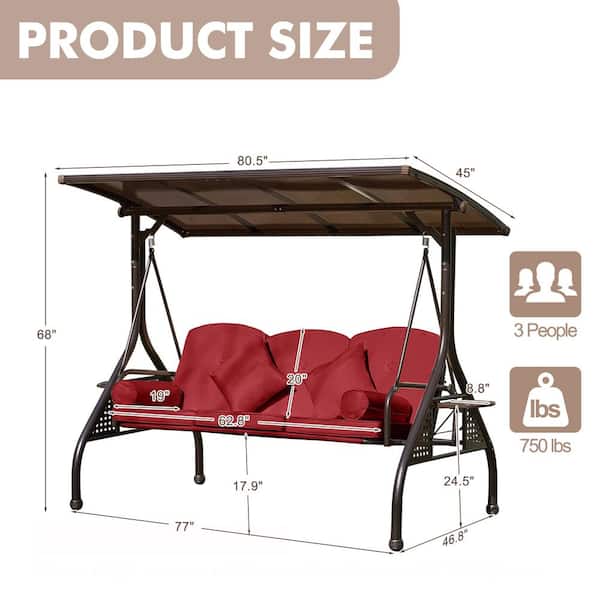 3-Person Metal Patio Swing Bench with Wine Red Cushion and Adjustable Canopy for Outdoor Garden Patio Porch and Poolside