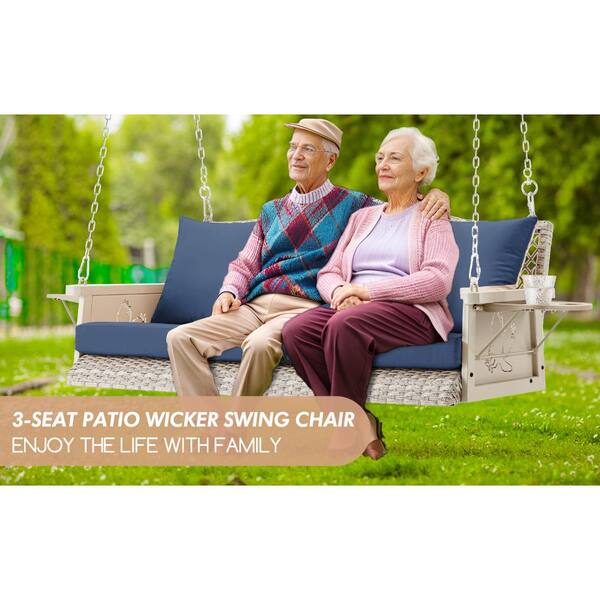 3-Person Patio Gray Wicker Hanging Porch Swing Bench Chair With Blue Cushion