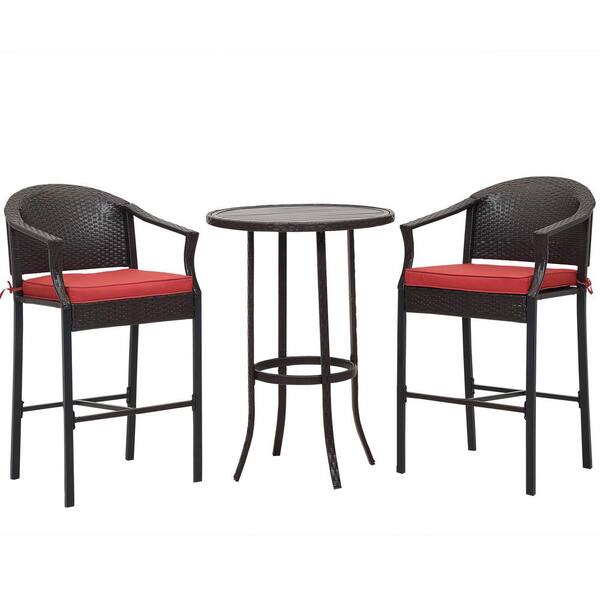 3-Piece Black Iron PE Wicker Patio Outdoor Serving Bar Set with Red Cushions for Poolside, Porch, Deck, Backyard