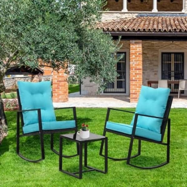 3-Piece Black PE Wicker Patio Outdoor Conversation Set with Blue Cushions, Rocking Chairs Set with Glass Coffee Table