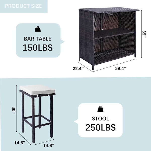 3-Piece Brown Wicker Patio Outdoor Conversation Bar Set with Beige Cushions, 1-Table and 2-Stools