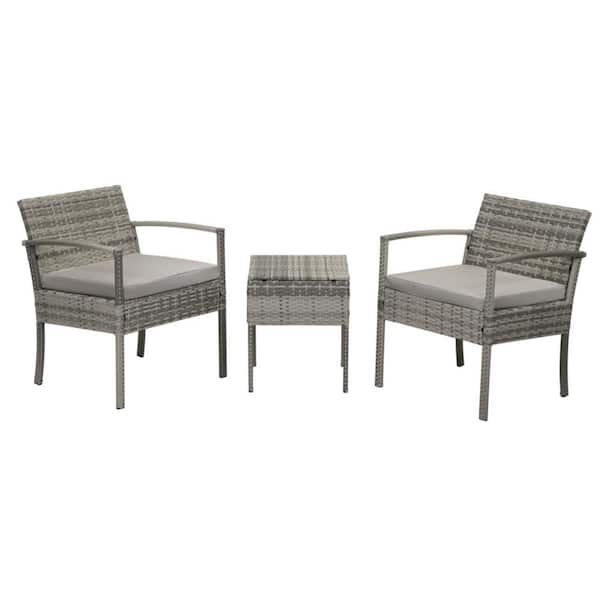 3-Piece Gray PE Wicker Patio Conversation Set with Gray Cushions for Garden, Backyard, Balcony, Lawn, Seats 2-Person