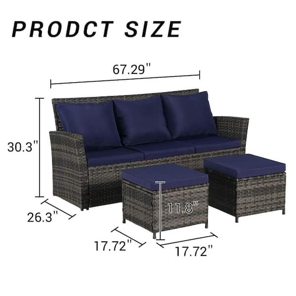 3-Piece Gray Patio Wicker Patio Conversation Set with Dark Blue Cushions and Two Ottoman for Porch Backyard