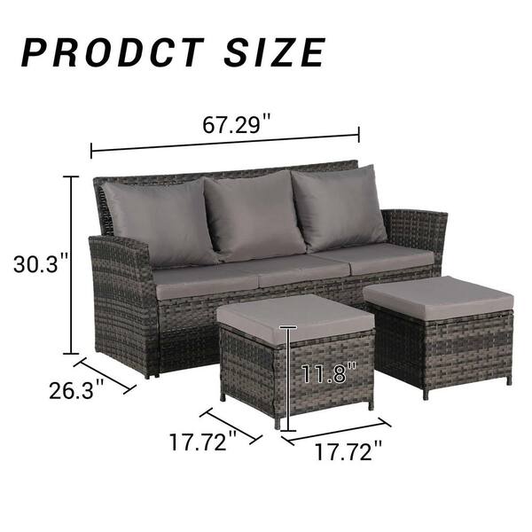 3-Piece Gray Patio Wicker Patio Conversation Set with Dark Gray Cushions and Two Ottoman for Porch Backyard