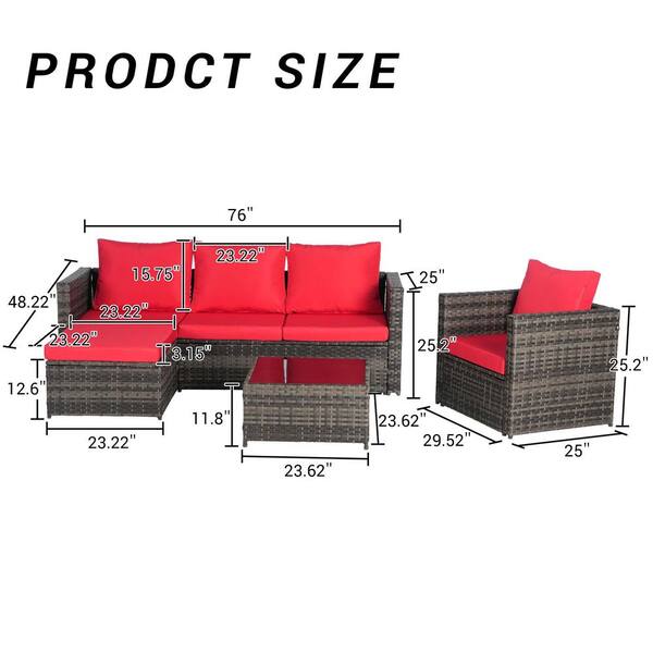 3-Piece Gray Wicker L-Shaped Outdoor Sectional Sofa Set with Red Cushions, Detachable Lounger, 1 Coffee Table