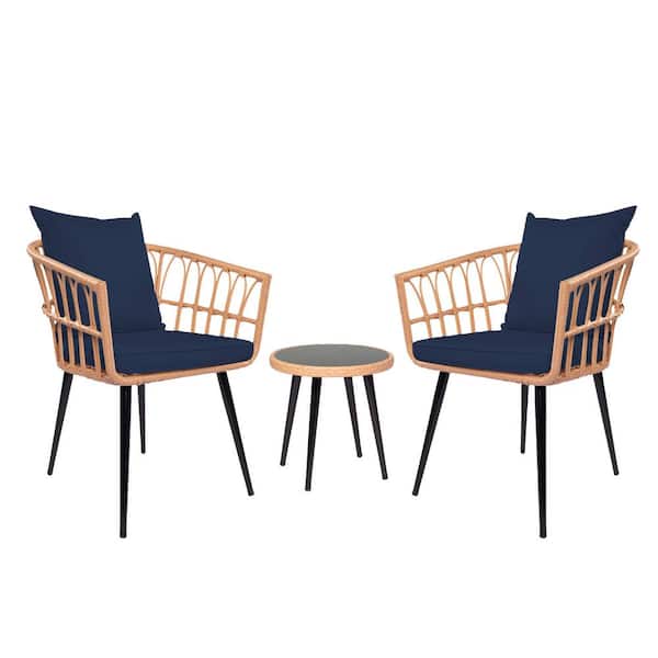 3-Piece PE Rattan Wicker Patio Outdoor Bistro Set with Dark Blue Cushions, Side Table, Coffee Table with Glass Top