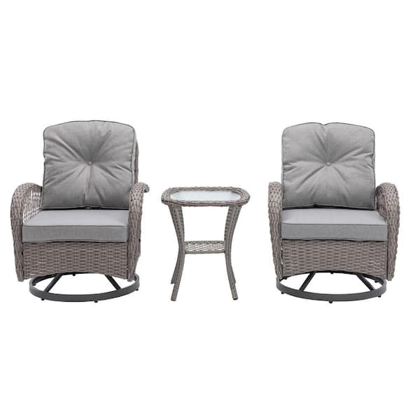 3-Piece Wicker Patio Conversation Set Swivel Rocker Chairs, 360° Rocking with Gray Cushions and Glass Coffee Table
